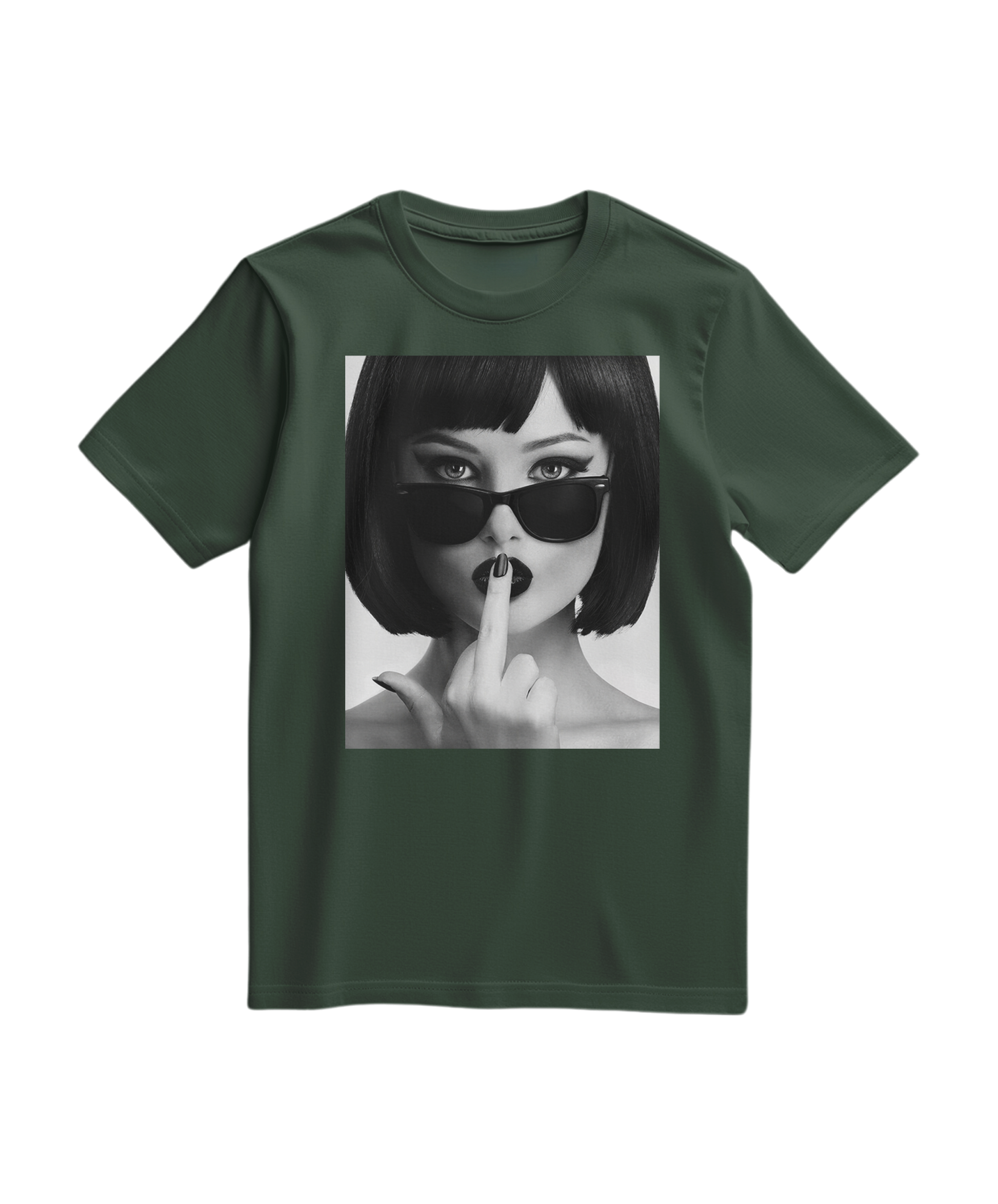 Liberta a tua atitude destemida e o teu humor atrevido com a t-shirt Silent Sass Portrait. Este modelo é puro impacto visual, apresentando uma fotografia fotorrealista em preto e branco de uma figura feminina icónica com um corte de cabelo bob, óculos de sol pretos e batom preto, encimado por um nome curto e trendy. A fusão perfeita de luxo de rua e rebeldia visual.