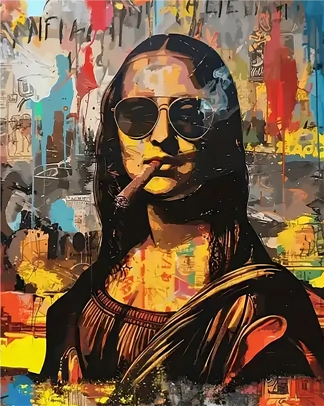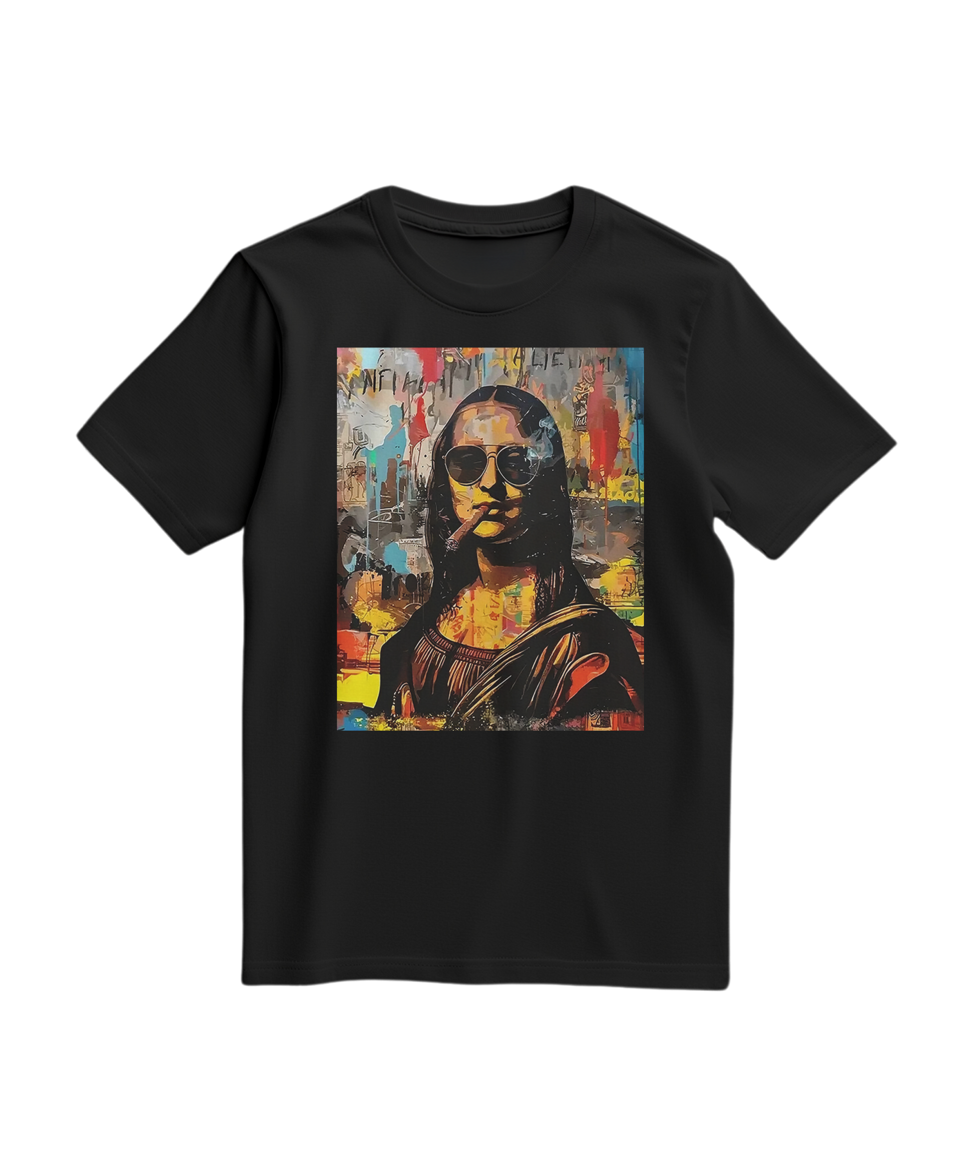 Redefine o conceito de obra-prima com a t-shirt MonArt. Este design é uma reinterpretação explosiva de um ícone eterno, fundindo o classicismo renascentista com a estética crua da street art e do pop-graffiti. Com óculos de sol, um charuto e um fundo repleto de texturas vibrantes e elementos gráficos, a MonArt é uma declaração de irreverência para quem vê a moda como uma forma de insurgência artística.