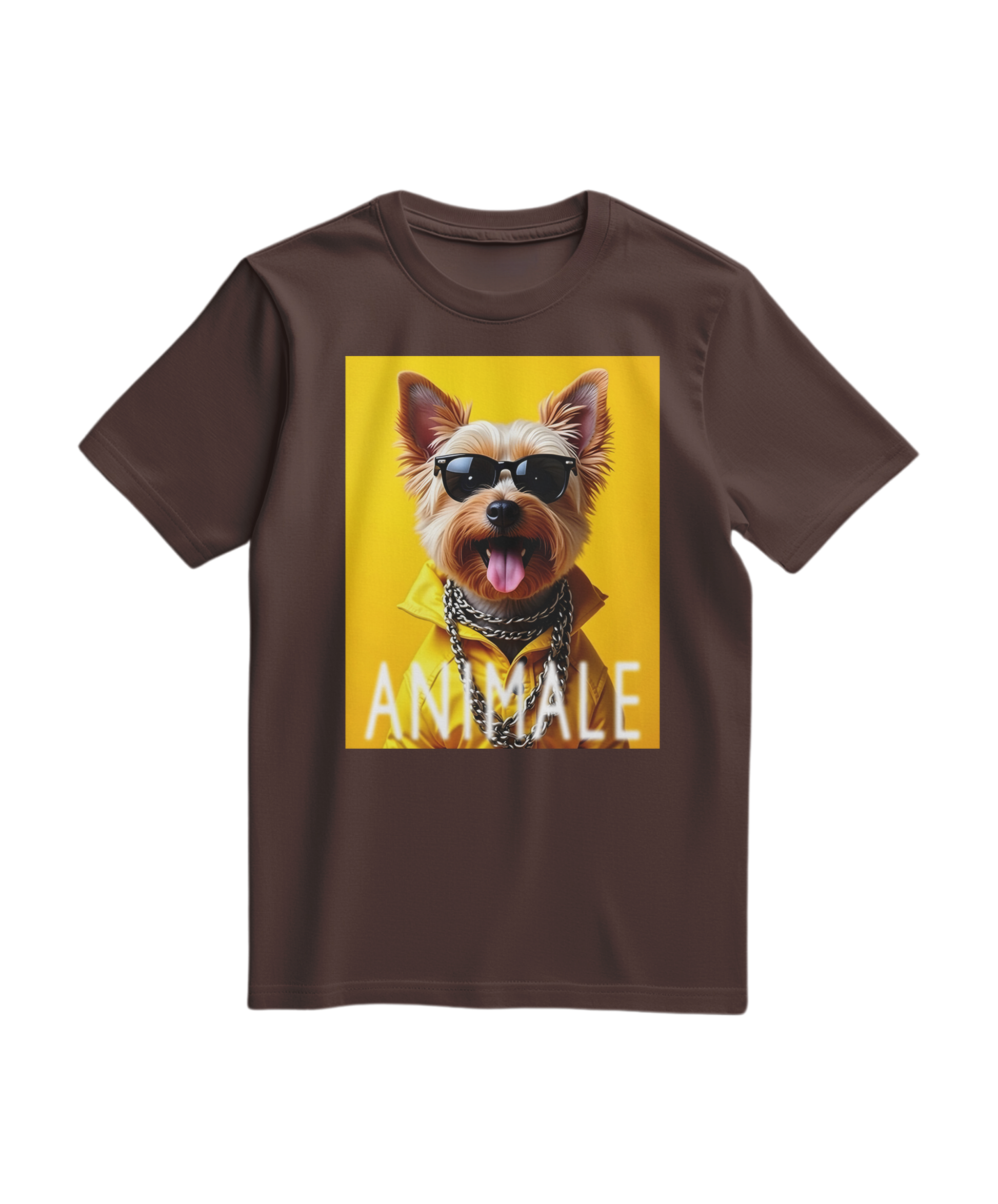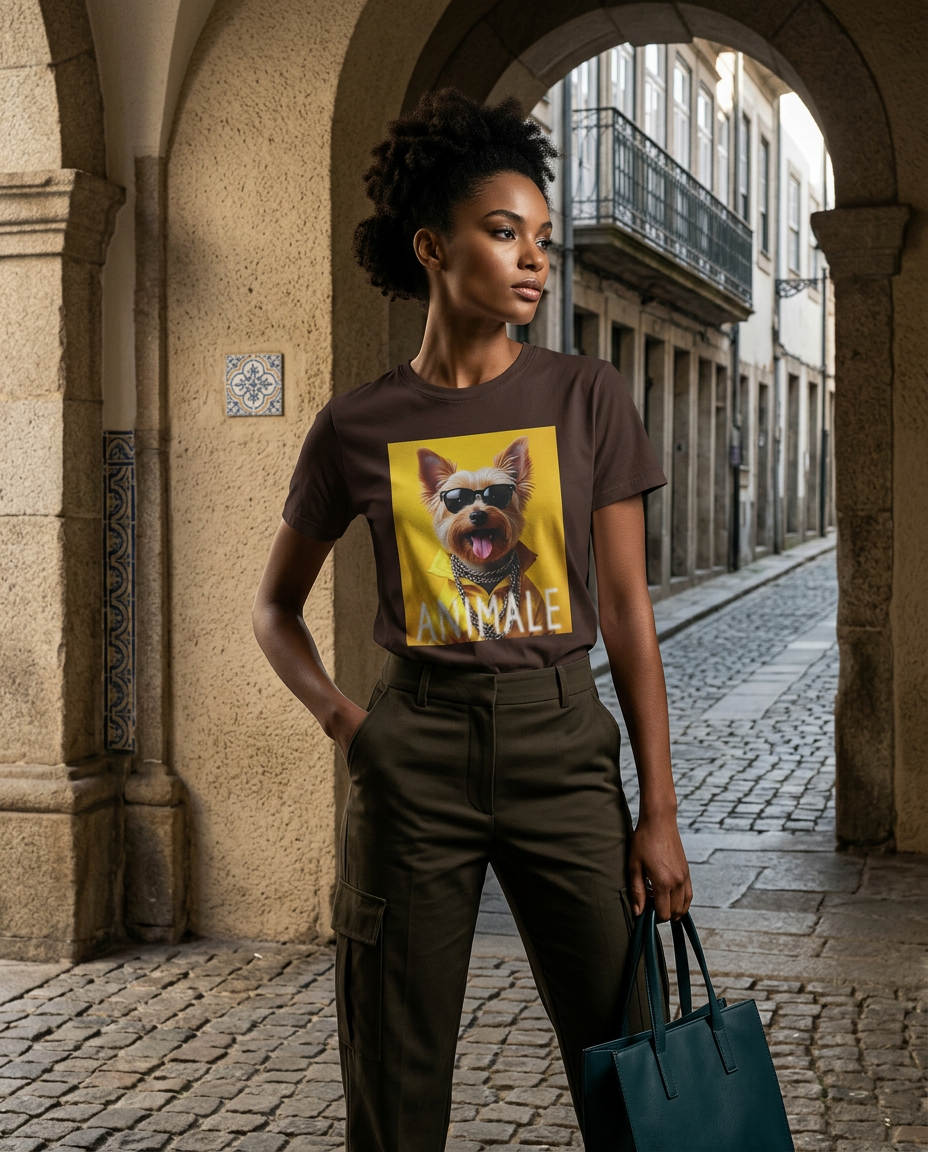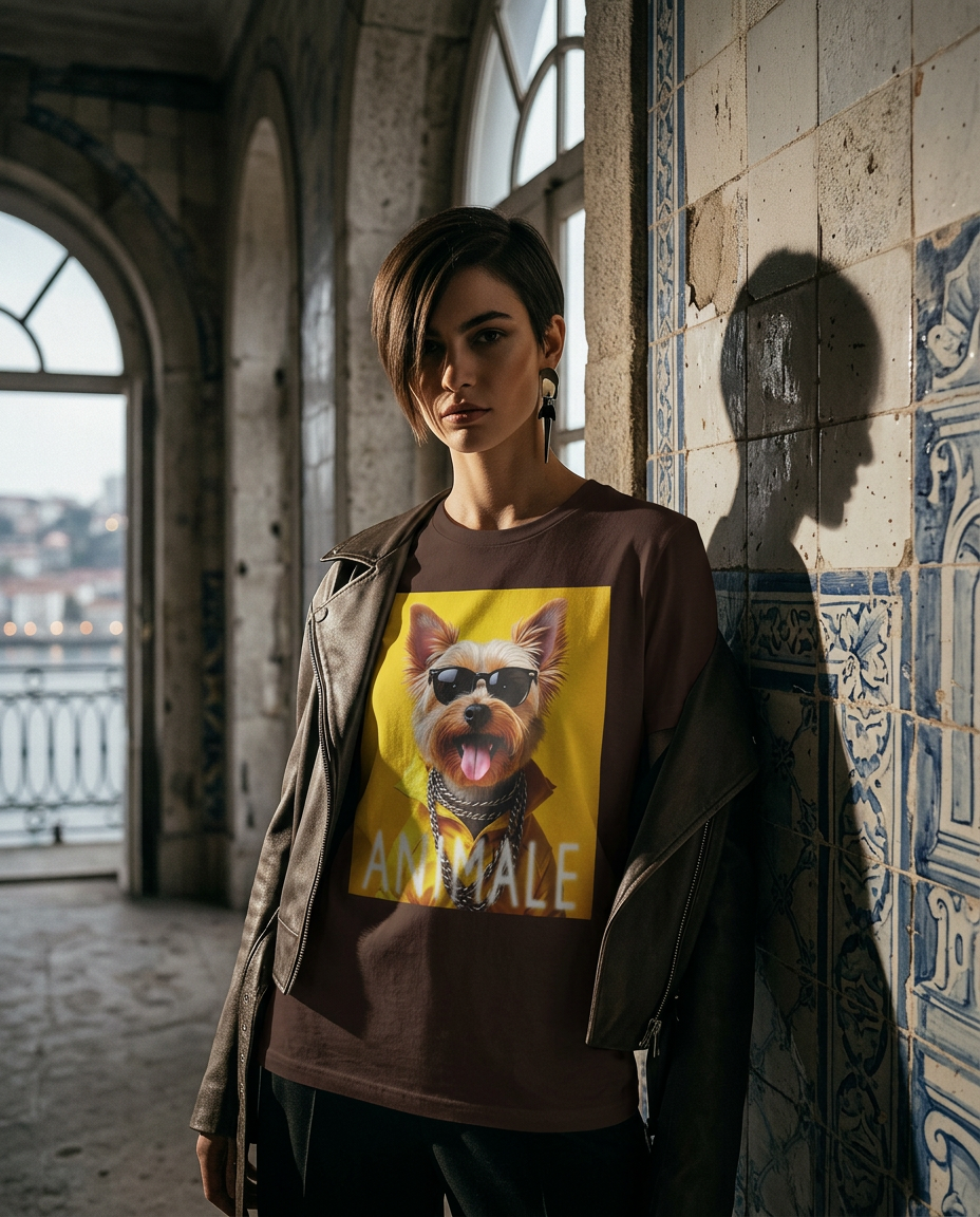 Assume o controlo das ruas com a t-shirt Dapper Yorkshire. Este modelo combina a elegância clássica com a rebeldia do streetwear, apresentando um Yorkshire Terrier cheio de confiança, equipado com óculos de sol escuros, um casaco amarelo vibrante e correntes prateadas. É a peça ideal para quem não tem medo de destacar a sua personalidade com um toque de humor e luxo urbano.